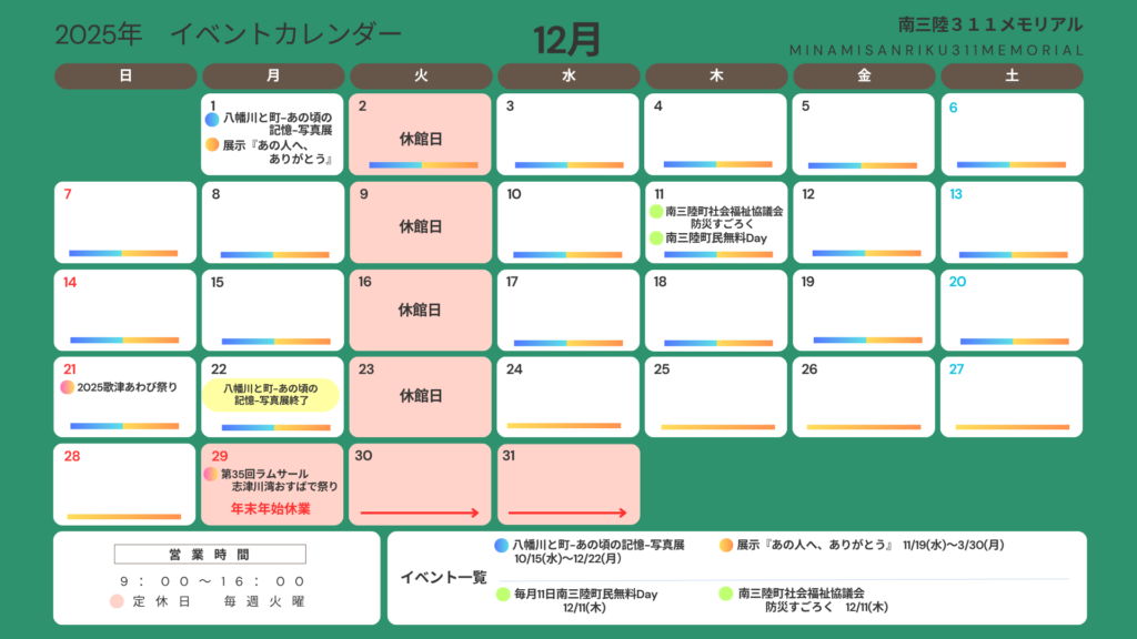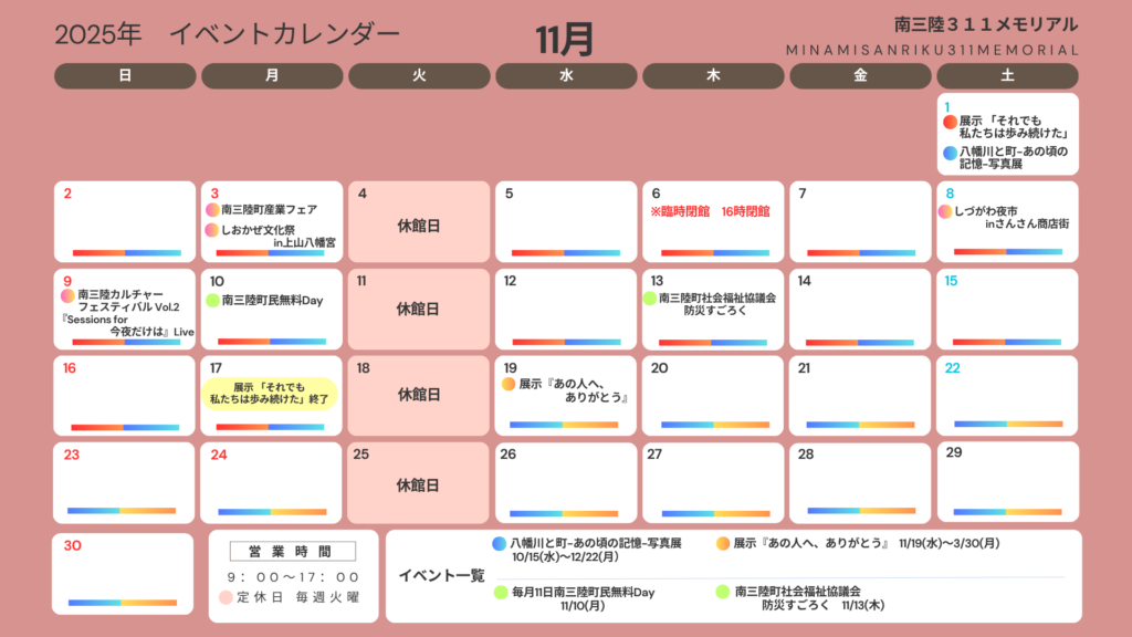 当館で行っているイベントの毎月のカレンダーを更新いたしました。 11月・12月の予定はこちらになります。