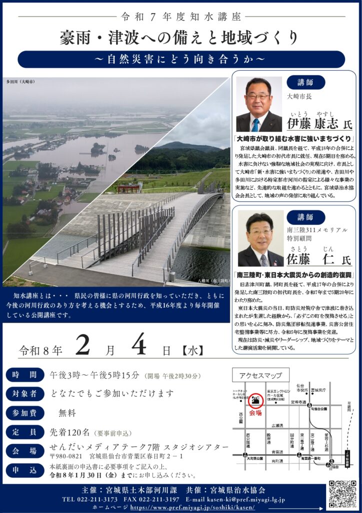 あわせて、大崎市長・伊藤康志氏による 「水害に強いまちづくり」の講演も行われ、 豪雨・津波などの自然災害に備えるための視点を多角的に学べる内容となっています。