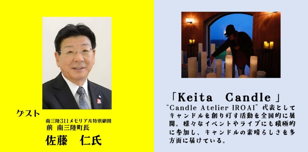 v また当日は、ゲストに南三陸311メモリアル特別顧問 佐藤仁氏(前南三陸町長)をお迎えし、