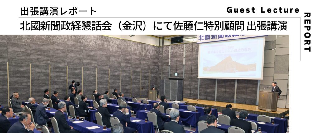 令和8年2月25日、石川県金沢市で開催された 北國新聞政経懇話会 において、南三陸311メモリアル特別顧問の 佐藤仁 が講演を行いました。